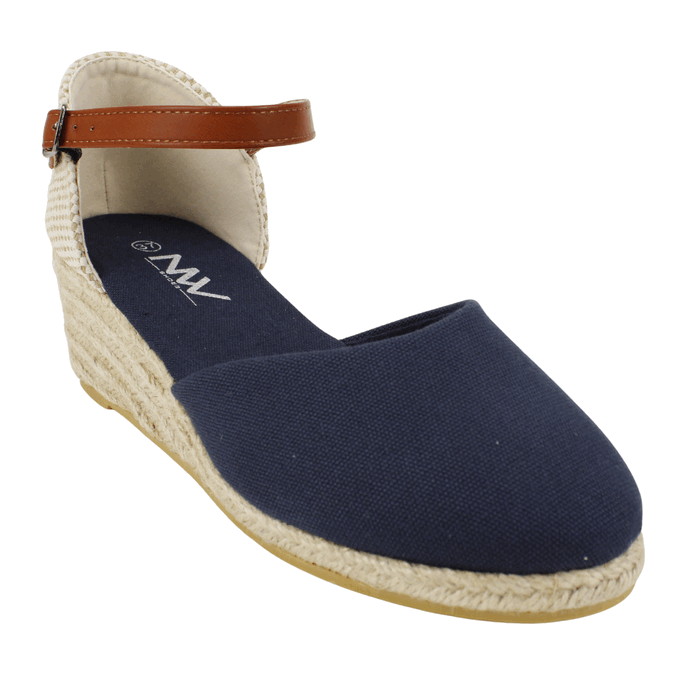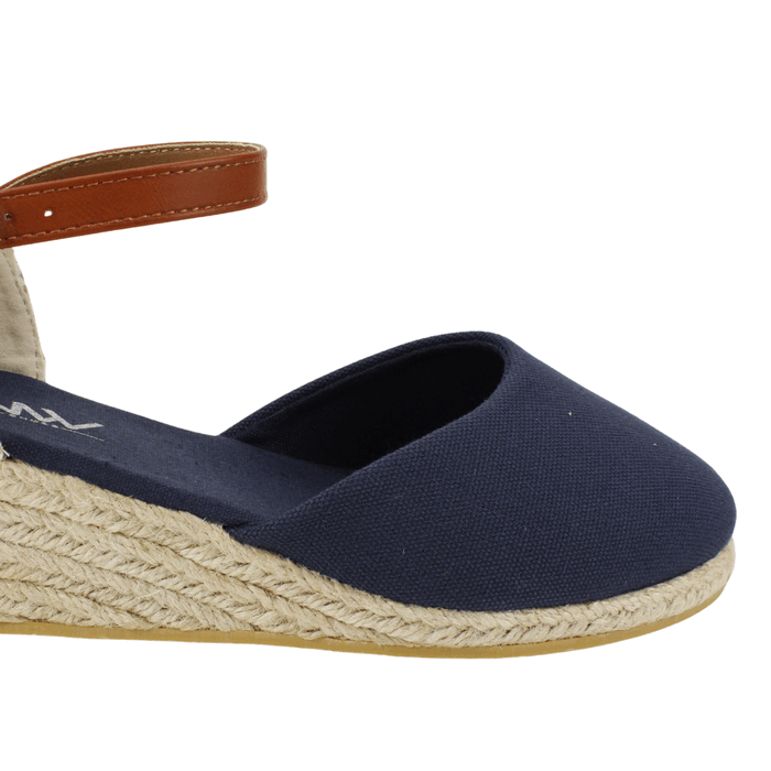 Alpargata de Mujer New Walk color azul marino. Estilo Casual. Redescubre el clásico veraniego con nuestra Alpargata de Cuña, el calzado esencial para la temporada. Este diseño atemporal presenta una puntera cerrada en lona resistente color azul marino y un talón con textura de tejido de yute, lo que le da un toque rústico y elegante. La cuña de yute trenzado de altura media proporciona comodidad y estabilidad, perfecta para caminar sin esfuerzo. La correa de tobillo en tono café con hebilla ajustable no solo contrasta bellamente, sino que también garantiza una sujeción segura. Ideales para paseos costeros, eventos al aire libre o un look casual chic de fin de semana. Ajuste mediante correa al tobillo. Taco Chino de 5,5 cm de altura y caña de 6,5 cm de alto.