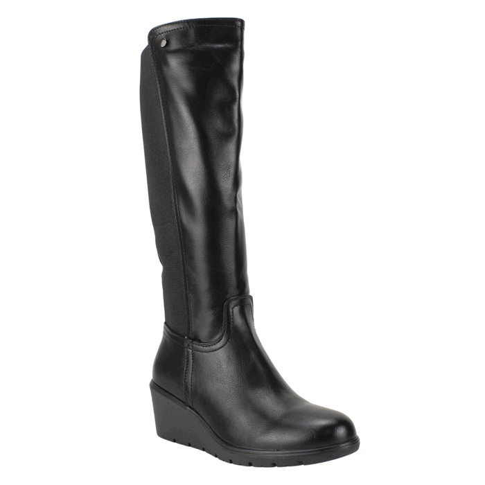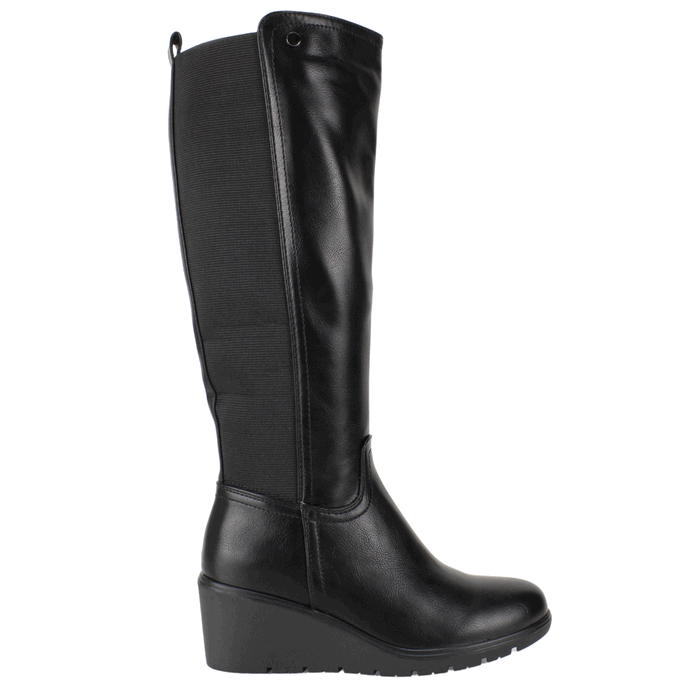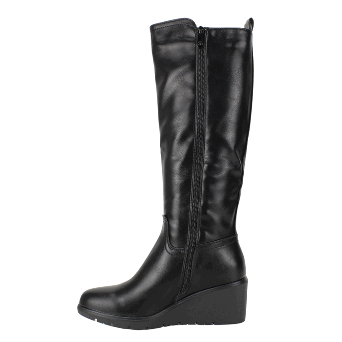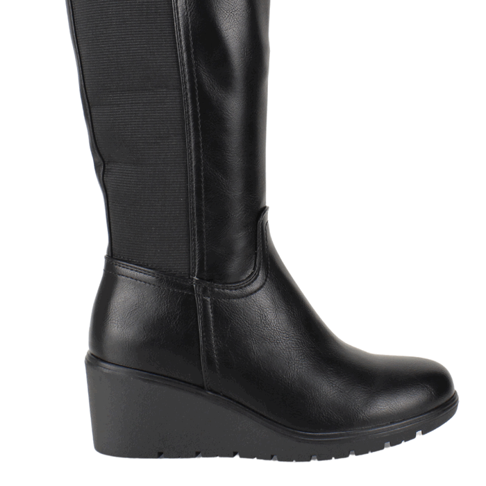 Bota de Mujer New Walk color Negro. Estilo casual. Diseñada para brindar elegancia y comodidad en cada paso. Su confección en material sintético suave con panel elástico en la parte trasera permite un ajuste perfecto a la pierna, asegurando confort durante todo el día. El tacón tipo cuña proporciona altura sin sacrificar estabilidad, mientras que la suela con patrón antiderrapante ofrece mayor seguridad al caminar. Ideal para complementar looks casuales o sofisticados en temporadas frías. Taco Chino de 6 cm de altura, caña de 35,5 cm y contorno de 35 cm.