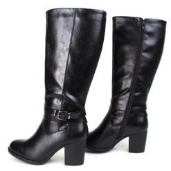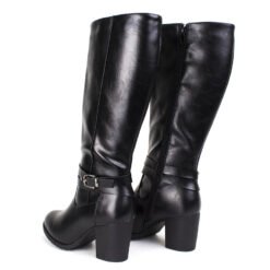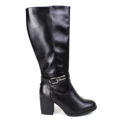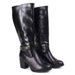 Bota New Walk Negro, fabricada en material Símil Cuero. Correa, hebilla y aplicaciones metálicas decorativas. Ajuste mediante cierre lateral.Taco cuadrado de 7 cm y caña de 34,5 cm. Material capellada: Símil Cuero. Material Forro: Textil. Material Planta: Goma. Horma Normal.