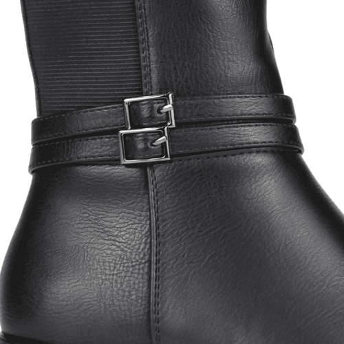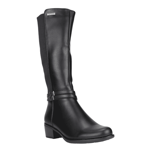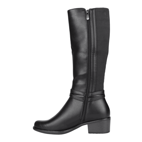 Bota de Mujer New Walk color Negro. Estilo casual. Diseño con parte posterior elastizada para mejor ajuste con dos hebillas decorativas en parte inferior, plantillas acolchadas que brindan mayor comodidad en el uso diario. Sistema de cierre lateral. Taco cuadrado de 4,5 cm y caña de 34 cm de alto y contorno de 34 cm.