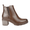 Botín de Mujer New Walk color café. Estilo Casual. Capellada en símil cuero texturizado con diseño de corte abierto con detalle de costuras visibles por el borde de la apertura, estilo simple pero moderno que combina con todos tus outfits. Ajuste tipo Slip On con tirador en parte trasera. Taco Cuadrado de 3,5 cm de altura y caña de 6,5 cm de alto.