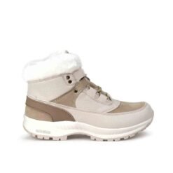 Botín Mujer New Walk color beige. Estilo Outdoor. Diseño con símil de piel en el tobillo y todo el interior incluyendo la planta. Ajuste mediante cordones redondos al tono. Planta 3 cm de altura. Caña de 9 cm. Material Capellada: Símil cuero y símil gamuza.Material Forro: textil.Material Planta: Goma. Horma Normal.