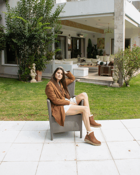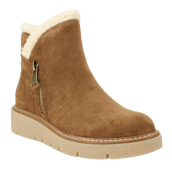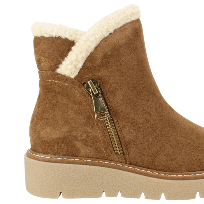 Botin de Mujer New Walk color camel. Estilo Casual. Fabricado en material tipo gamuza con forro interior afelpado en el borde superior. Su ajuste es mediante un cierre en el costado interno, mientras que el cierre exterior es decorativo. Cuenta con una suela ligera y con buena tracción, además de detalles en contraste que aportan un toque estilizado. Ideal para complementar tus outfits de temporada con comodidad y estilo. Plataforma de 3,5 cm de altura, caña de 13 cm.