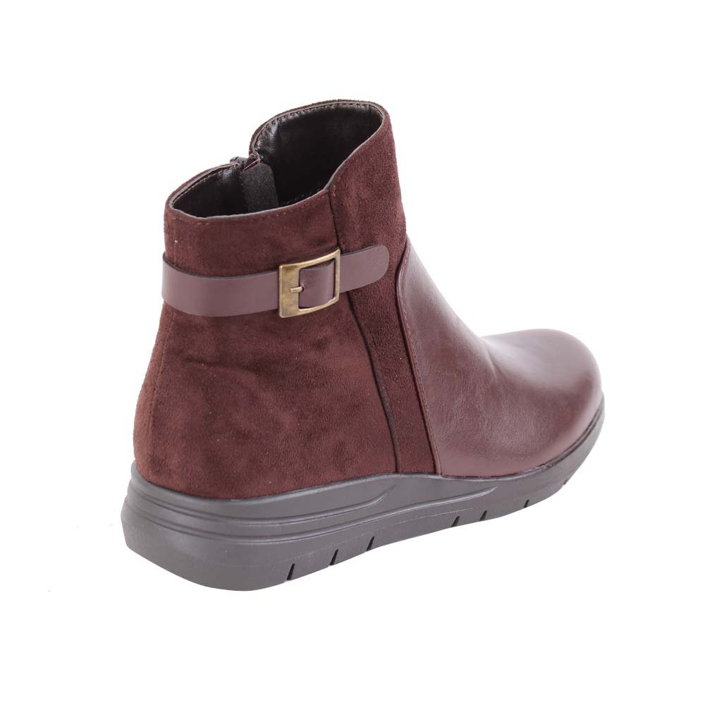 Botín Mujer New Walk color café. Estilo casual. Capellada mixta símil cuero liso y símil cuero gamuza. Hebilla decorativa en costado externo. Sistema de ajuste mediante cierre ubicado en costado interno. Forro poliester. Planta de 3 cm de altura. Caña de 10,5 cms. Plantilla comfort. Capellada: Poliuretano. Forro: Poliester. Planta: Goma. Horma Normal.