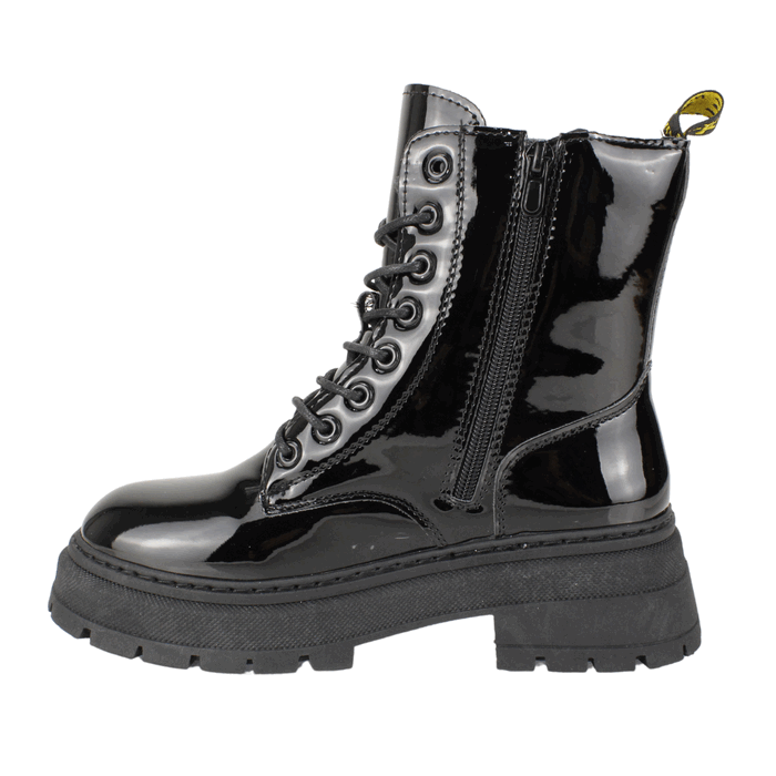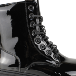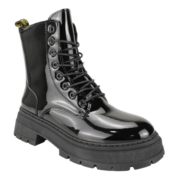 Botin de Mujer New Walk color negro. Estilo Militar. Fabricado en material charolado con acabado brillante, que aporta un toque sofisticado y llamativo. Su suela gruesa y dentada brinda mayor estabilidad y comodidad al caminar. Ajuste mediante agujetas funcionales en la parte frontal para un ajuste personalizado, complementadas con un práctico cierre lateral para mayor facilidad al poner y quitar. Perfecto para quienes buscan estilo y comodidad en un solo calzado. Plataforma de 4,5 cm de altura, caña de 15 cm.