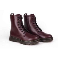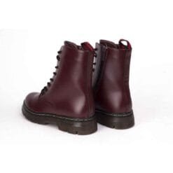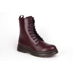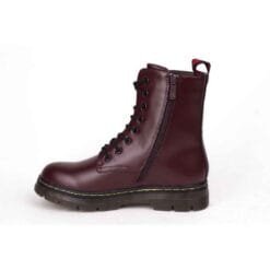 Botín New Walk color Burdeo. Estilo militar. Capellada sintética opaca con pespunte a tono. Ajuste mediante cordones redondos de color negro y/o cierre lateral al tono. Planta de 4 cm de altura. Caña de 15,3 cm. Material Capellada: Sintético. Material Forro: textil. Material Planta: Goma. Horma Normal.