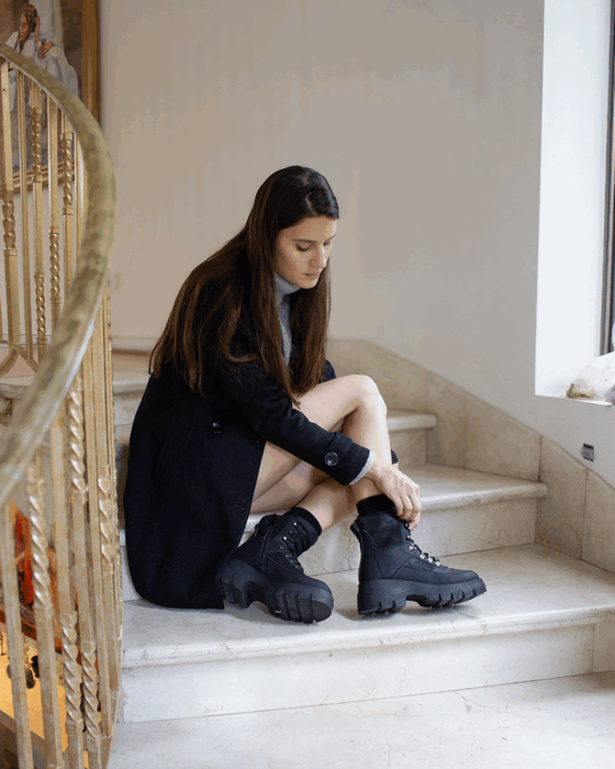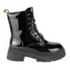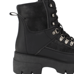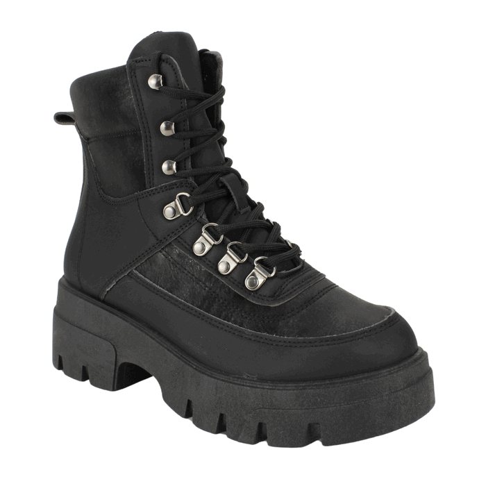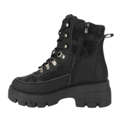 Botin de Mujer New Walk color Negro. Estilo Militar. Diseño robusto y moderno que combina funcionalidad con un look vanguardista. Fabricado en materiales sintéticos con detalles en acabado tipo gamuza, aporta un toque sofisticado y resistente. Su ajuste con agujetas y ganchos metálicos permite una sujeción firme y personalizada, y además cuenta con un cierre en el costado interno, lo que lo hace más fácil de poner. La suela gruesa con relieve dentado brinda estabilidad y tracción en cualquier terreno. Perfecto para quienes buscan comodidad y estilo en cada paso, ya sea en la ciudad o en una aventura al aire libre.