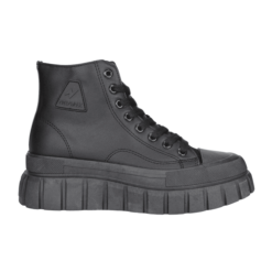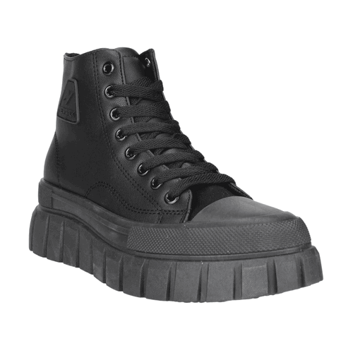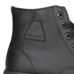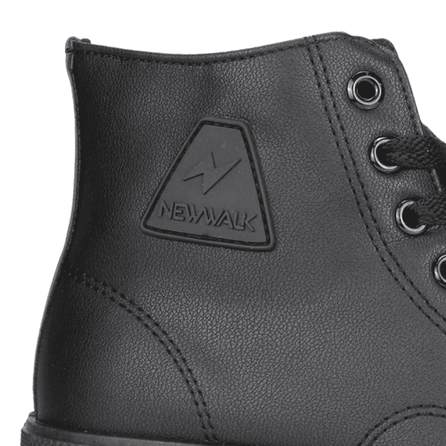 Botín de Mujer New Walk tipo Militar color Negro. Estilo Militar. Capellada de Poliuretano, Forro de Poliéster y Planta Track de PVC con 5.5 cm de altura. Caña de 10,5 cm. Ajuste mediante cordones al tono. Punta Reforzada.