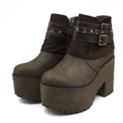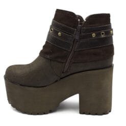 Botín New Walk Marrón. Estilo Casual. Taco estilo Plataforma de 11 cm en parte del talón y 5 cm de plataforma. Capellada Símil cuero adornada con cintas y tachas. Cierre Lateral mediante cremallera.Material Capellada: Símil cuero. Material Forro: Textil. Material Planta: Símil madera (sintética). Horma Normal.
