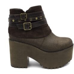 Botín New Walk Marrón. Estilo Casual. Taco estilo Plataforma de 11 cm en parte del talón y 5 cm de plataforma. Capellada Símil cuero adornada con cintas y tachas. Cierre Lateral mediante cremallera.Material Capellada: Símil cuero. Material Forro: Textil. Material Planta: Símil madera (sintética). Horma Normal.