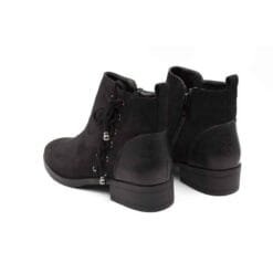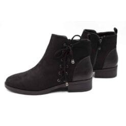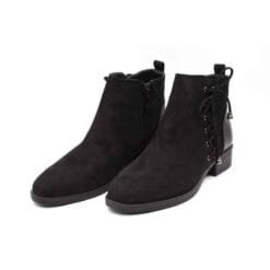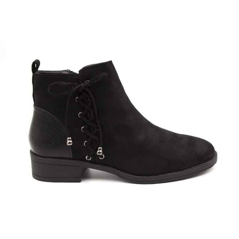 Botín New Walk color Negro. Estilo casual. Capellada símil gamuza con cordones planos y ojales metálicos decorativos. Tolón reforzado con textura reptil. Taco cuadrado de 3,5 cm. Ajuste mediante cierre lateral. Altura caña 11 cm. Capellada: Simil Gamuza. Forro: Textil. Planta: Goma. Horma Normal.