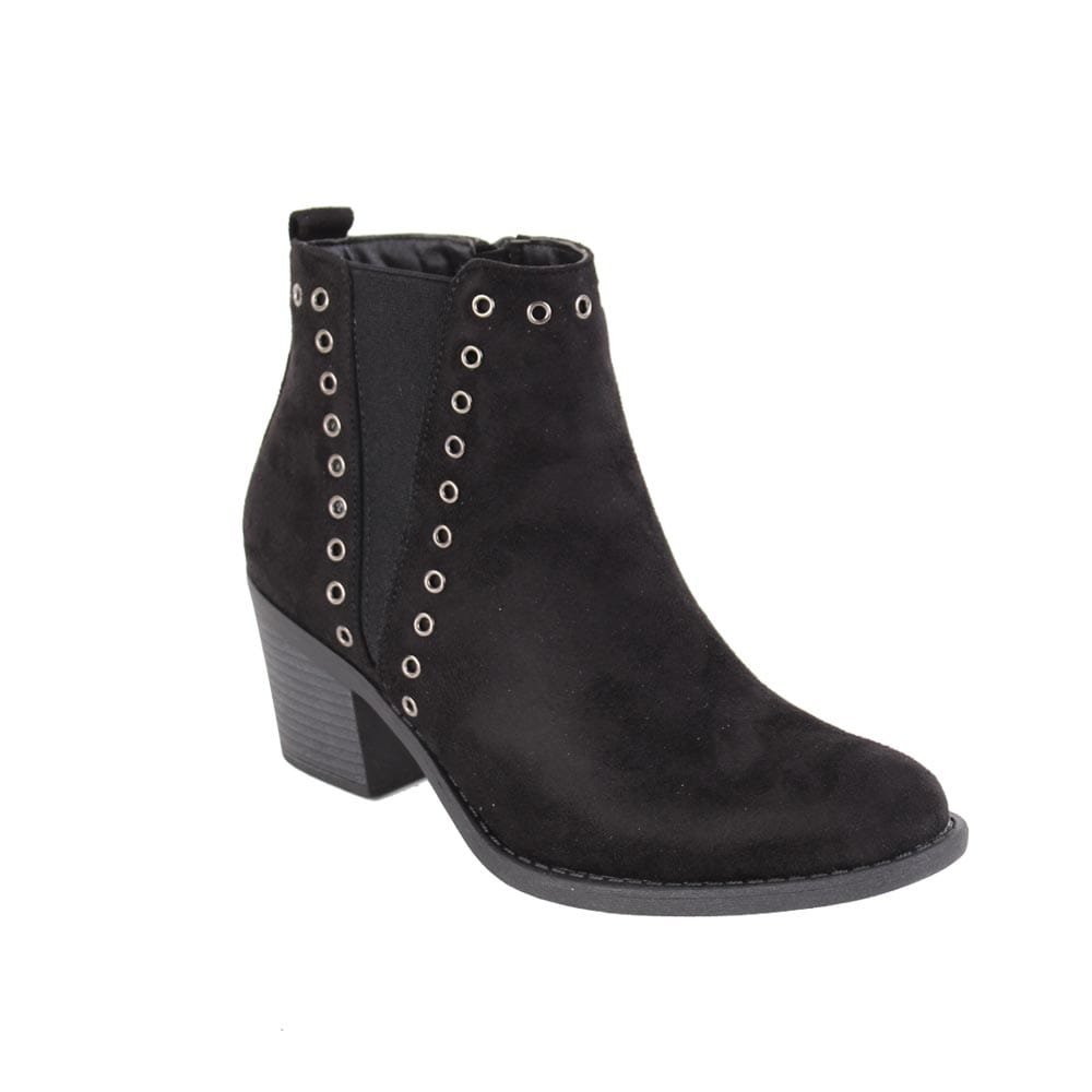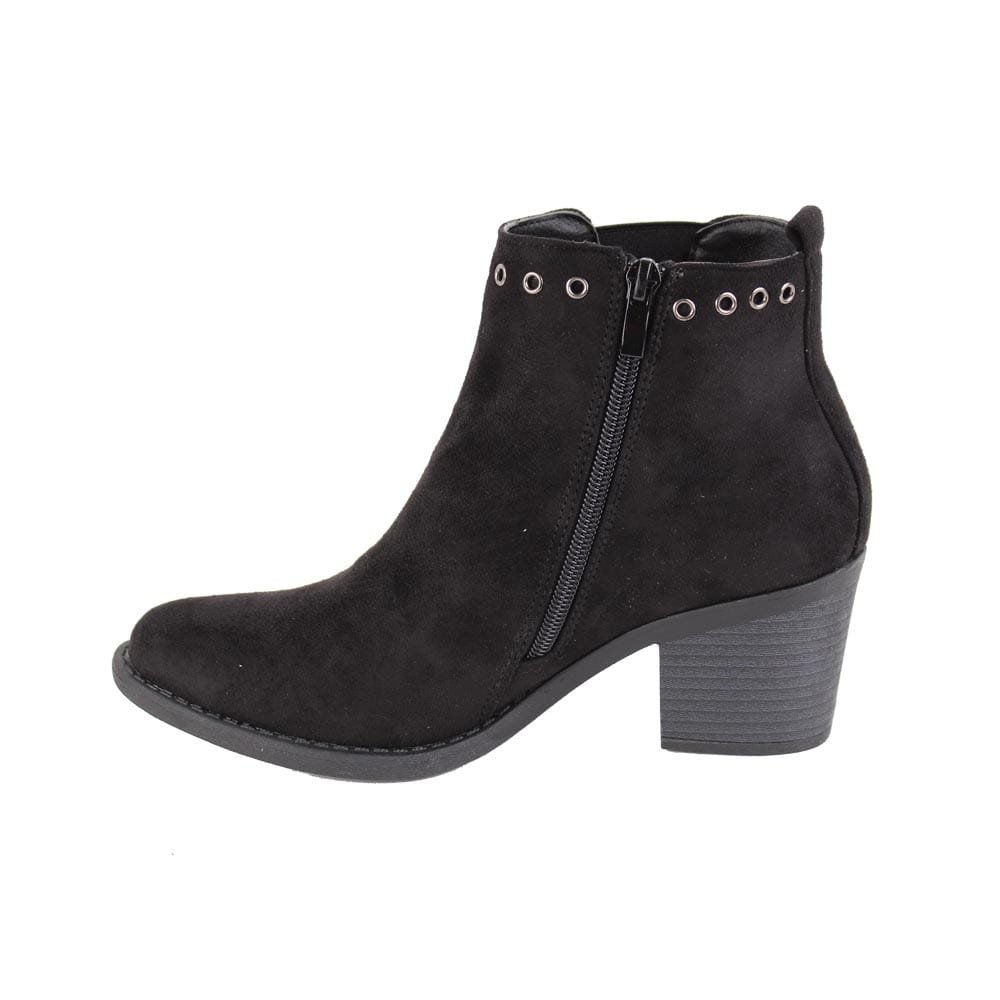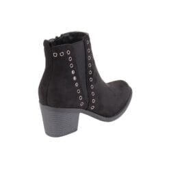 Botín Mujer New Walk color negro. Estilo casual. Capellada símil y gamuza. Ojetillos decorativos en tonos plata . Sistema de ajuste mediante cierre en costado interno. Forro poliester. Taco de cuadrado de 6,5 cm de altura. Caña de 10 cms Capellada: Poliester. Forro: Poliester. Planta: Goma. Horma Normal.