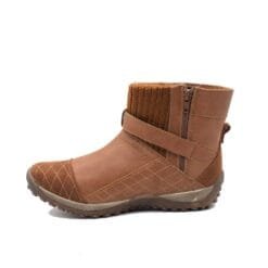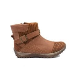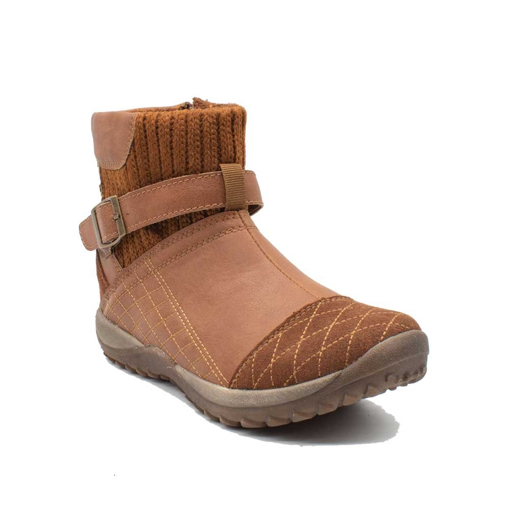 Botín Mujer New Walk color camel, estilo casual. Capellada símil cuero gamuza con detalle de tejido en la parte superior del botín. Hebilla decorativa a la altura del tobillo. Costuras en contraste. Cierre mediante cremallera ubicada en costado interno. Suela de 3 cm y caña de 12 cm de alto.Materiale Capellada: Poliuretano. Forro: textil. Planta: Goma. Horma normal