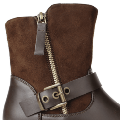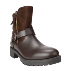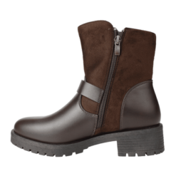 Botín Mujer New Walk color café. Estilo casual. Capellada de símil gamuza y Eco Cuero con detalle de cierre y broche decorativos. Ajuste mediante cierre lateral. Taco cuadrado de 4 cm de altura y caña de 14 cm.