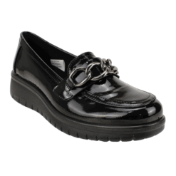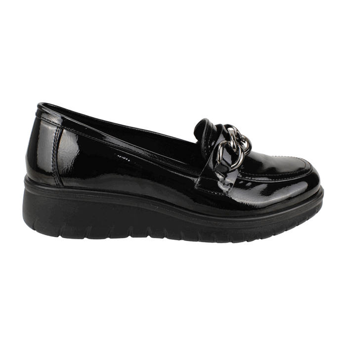 Mocasines de Mujer New Walk color negro. Estilo Confort y Casuales. ¡Marca tendencia con un toque sofisticado! Estos modernos mocasines de la línea Eccoflex de New Walk destacan por su acabado en charol brillante y un elegante detalle de cadena metálica en el empeine. Su suela de plataforma ligera no solo añade altura, sino que proporciona una amortiguación excepcional para el uso diario. Ideales para un look preppy o profesional, estos zapatos combinan texturas modernas con la tecnología de confort característica de la marca. Ajuste tipo Slip On. Plataforma de 4 cm de alto y caña de 6,5 cm de altura.