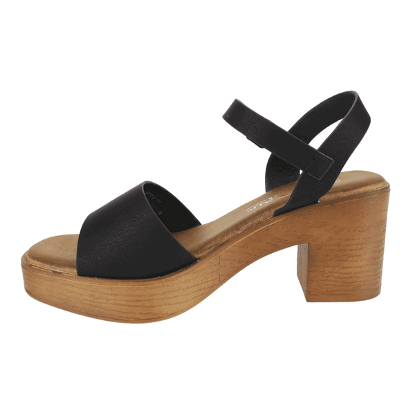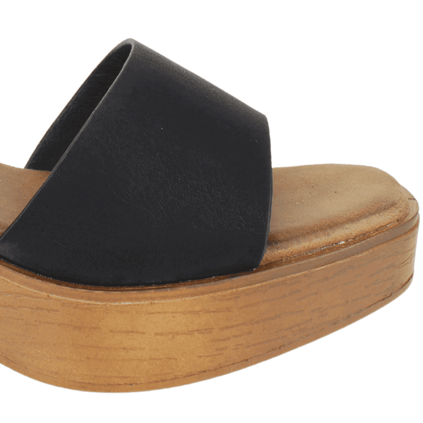 Sandalia de Mujer New Walk color negro. Estilo Casual. Capellada en símil cuero con texturas lisa con detalles de cinta gruesa que cruza a la altura del empeine. Plantilla confort, perfecta para el uso diario que brinda un suave caminar. Ajuste mediante broche metálico a la altura del talón. Plataforma de 8 cm de altura en su parte más alta.