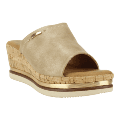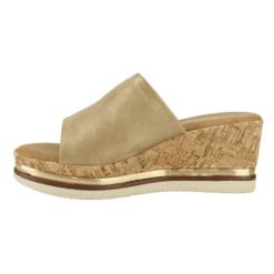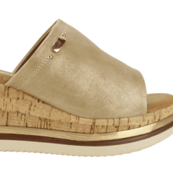 Sandalia de Mujer New Walk color dorado. Estilo Casual. Capellada en símil cuero liso con cinta central en tono brillante con costuras dobles visibles y adorno metálico en bordo superior. Ajuste tipo Slip On. Taco Chino de 7,5 cm de alto.