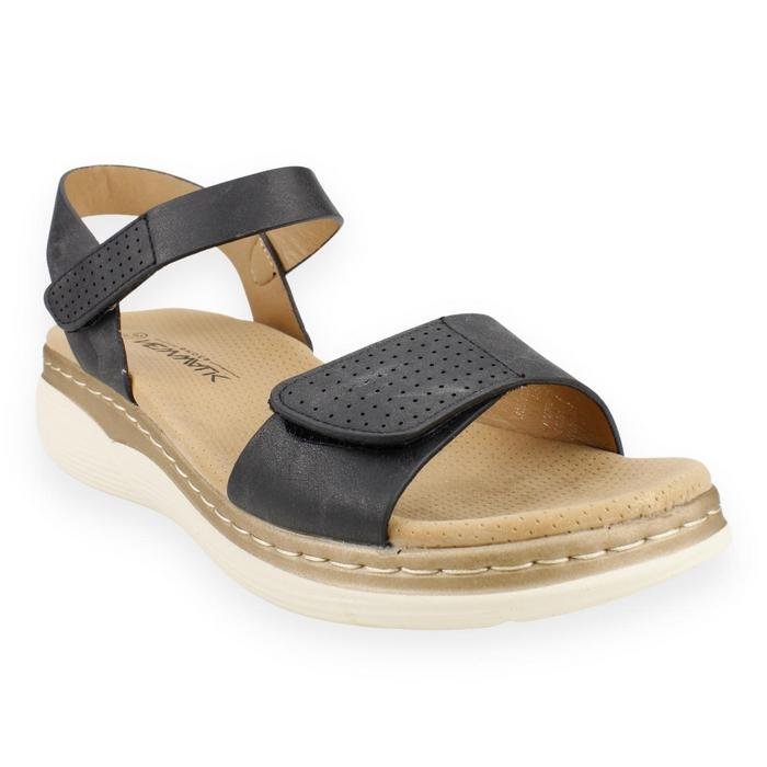 Sandalia Mujer New Walk plana estilo casual color negro. Capellada abierta con ajuste decorativo con doble hebilla . Planta de 4 cms de altura. Capellada: Poliuretano, Forro: Poliuretano y planta de poliuretano. Horma normal.