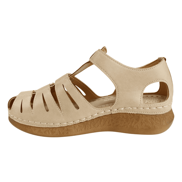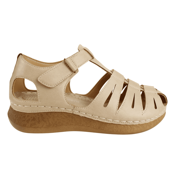 Sandalia de Mujer New Walk color Beige. Estilo Confort. Capellada semi abierta de símil cuero liso con detalles troquelados a lo largo del calzado, plantilla confort, perfecta para el uso diario. Ajuste mediante velcro en parte posterior. Plataforma de 3 cm de alto y caña de 7 cm de altura.