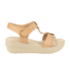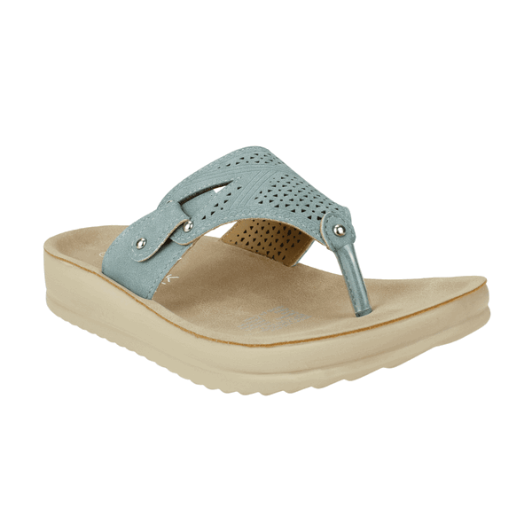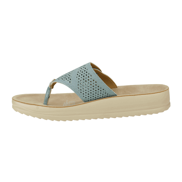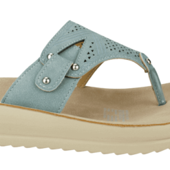 Sandalia de Mujer New Walk color Turquesa. Estilo Havaiana. Capellada abierta de símil cuero liso con detalles troquelados con tachas decorativos y grabados en distintas formas y líneas. Ajuste tipo Slip On con plástico protector para los dedos. Plataforma de 3,5 cm de alto.
