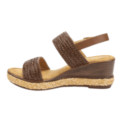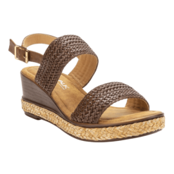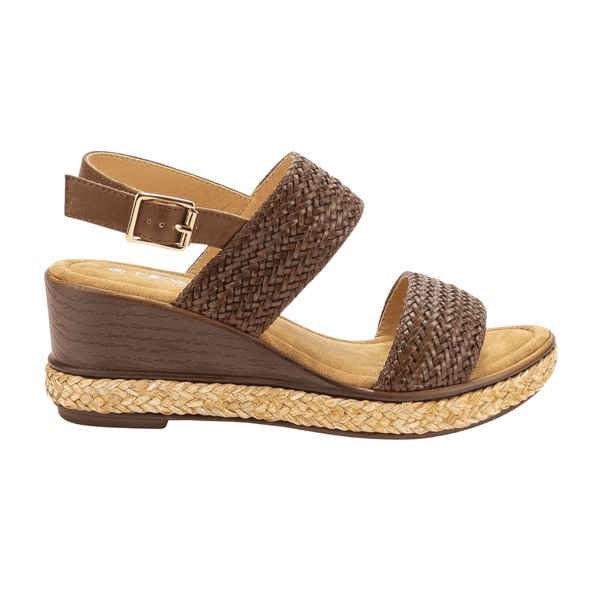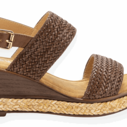 Sandalia de Mujer New Walk color Café. Estilo Casual. Capellada de símil cuero liso con detalles trenzado en las 2 cintas que cruzan el empeine y planta con yute alrededor del contorno. Ajuste mediante broche en la parte posterior. Taco chino de 6 cm de alto.