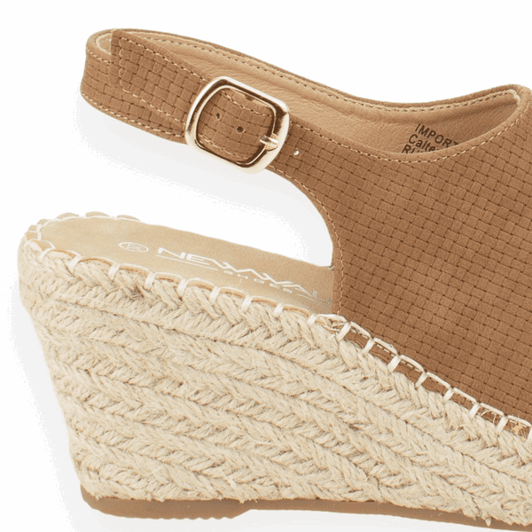 Sandalia de Mujer New Walk color Marrón. Estilo Casual. Capellada de símil cuero con patrón de líneas entrecruzadas con detalle de yute en la planta y costuras visibles a lo largo del borde del calzado. Ajuste por sistema de broche a la altura del talón. Taco Chino de 7,5 cm de alto.