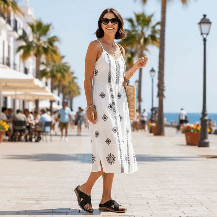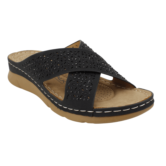 Sandalia de Mujer New walk color negro. Estilo Casual. La Sandalia Slip On Negra con Perforaciones es el equilibrio perfecto entre comodidad, frescura y un toque de glamour sutil. Un diseño fácil de llevar que realza tu look casual. Esta sandalia tipo slide presenta un elegante diseño de tiras cruzadas anchas en color negro mate. La capellada está adornada con perforaciones láser de forma intrincada y sutiles detalles de brillo incrustados en las perforaciones, creando un patrón sofisticado y que permite la transpiración. La suela es de altura baja a media en un tono camel contrastante, lo que añade un soporte cómodo sin la altura de una plataforma completa. Perfecta para salidas de día, paseos de verano y cuando buscas comodidad con un toque de distinción. Ajuste tipo Slip On. Plataforma de 4 cm de altura.