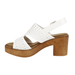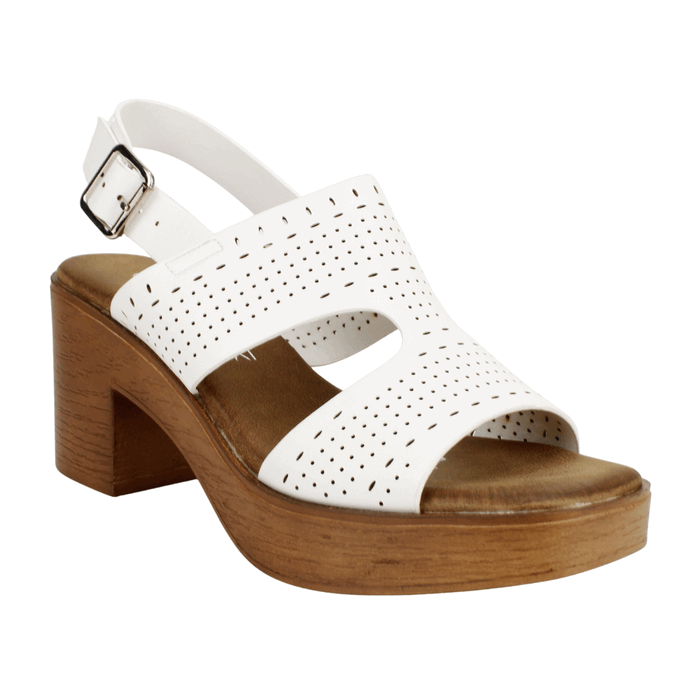 Sandalia Mujer New Walk color Blanco. Estilo Casual. Consigue la altura que deseas con la máxima estabilidad. Estas sandalias de tacón grueso son la pieza clave para actualizar tu vestuario. La combinación del blanco de moda con el vibrante contraste de la base de imitación madera crea un impacto visual moderno y actual. Su diseño incluye una plataforma delantera que reduce la inclinación del pie, haciéndolas increíblemente cómodas para llevarlas durante horas. El tejido de la pala, con un patrón perforado, es transpirable y elegante. Perfectas como sandalias de vestir o para un look casual elevado. Ajuste mediante correa y broche. Taco cuadrado de 7,5 cm, plataforma de 2,5 cm de altura y caña de 6 cm de alto.