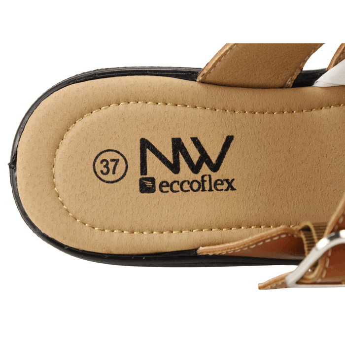 Sandalia de Mujer New Walk color marrón. Estilo Confort. La Sandalia Tipo Pala Marrón NW Eccoflex es el epítome de la comodidad para el uso diario. Diseñada como una sandalia slip-on de puntera abierta, ofrece la máxima facilidad de calzado y frescura. La capellada de cuero sintético en color marrón presenta un diseño de tiras cruzadas y un ajuste lateral con hebilla metálica para una sujeción personalizada y un detalle clásico. La suela flexible de Eccoflex y la plantilla contorneada y acolchada están diseñadas para brindar soporte ergonómico, absorbiendo el impacto y proporcionando una sensación de descanso. Ideal como sandalia de casa, para la oficina o para paseos cortos donde la prioridad es el bienestar de tus pies. Ajuste tipo Slip On. Taco Cuadrado de 3,5 cm de altura.