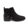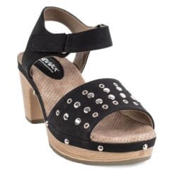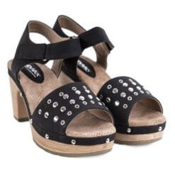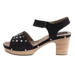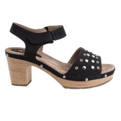 Sandalia negra . Capellada abierta símil gamuza con tachas decorativas y sistema de cierre con velcro en tobillo. Taco de 7,5 cms de altura. Capellada: PU, Forro: PU y planta de PU. Horma pequeña.
