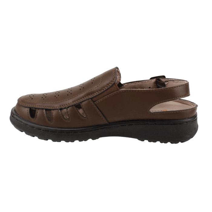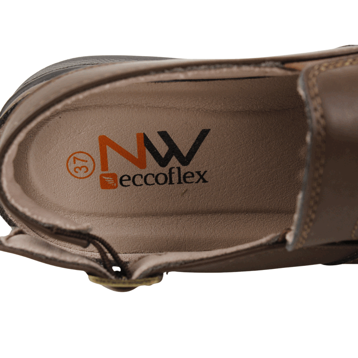 Sandalia de Mujer New Walk color café. Estilo Confort. Combina el estilo clásico de un mocasín con la frescura de una sandalia gracias a nuestra sandalia abierta. Confeccionada en símil cuero color café de alta calidad, este calzado es la solución perfecta para quienes buscan soporte y comodidad durante todo el día. El diseño presenta una puntera semicerrada con un panel de micro-perforaciones para una ventilación superior, ideal para climas cálidos. La parte del talón es abierta y se ajusta con una correa de hebilla para mayor seguridad. La suela gruesa y antideslizante con tecnología ortopédica Eccoflex proporciona una amortiguación excepcional, absorbiendo el impacto en cada paso. Un calzado funcional, elegante y cómodo para el uso diario. Ajuste mediante correa con broche a la altura del tobillo. Plataforma de 3 cm de altura.