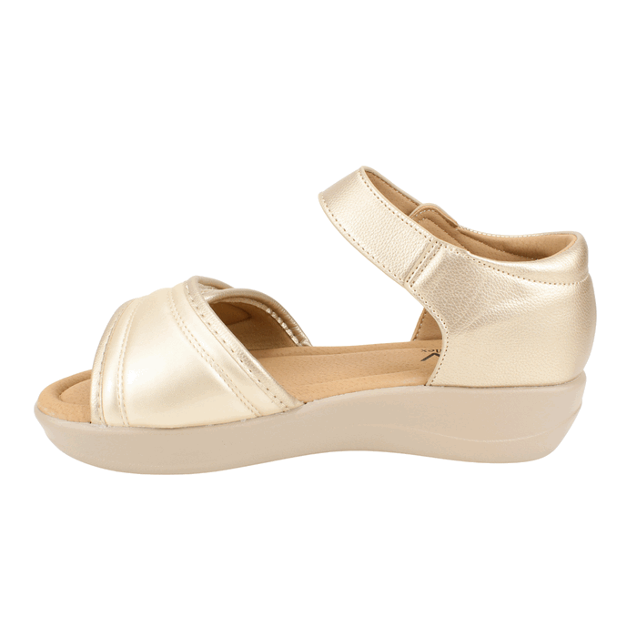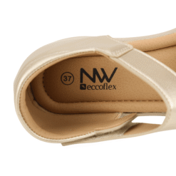 Sandalia de Mujer New Walk color dorado. Estilo Confort. Añade un toque de brillo a tus días con las Sandalias NW EccoFlex en elegante color dorado. Este modelo no solo destaca por su estilo moderno y festivo, sino que también ofrece un nivel de confort ortopédico insuperable gracias a la tecnología EccoFlex. Son perfectas para mujeres que buscan calzado elegante y cómodo para eventos, salidas o para el día a día. El diseño con doble ajuste de velcro (en el empeine y el tobillo) permite una calzada rápida y un ajuste totalmente personalizado, ideal para pies que tienden a hincharse o que necesitan un soporte específico. La plantilla acolchada y ergonómica te brinda una amortiguación excepcional, y la plataforma baja proporciona la altura ideal sin cansar tus pies. ¡Comodidad y glamour en un solo calzado! Ajuste mediante velcro. Plataforma de 4 cm de altura y caña de 6 cm de alto.