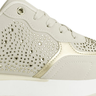 Zapatilla de Mujer New Walk Beige estilo Casual. Diseñada con Capellada con adornos de Tachas y Brillantes. Planta en forma de Plataforma recta de 3 cm de altura. Caña de 7.5 cm de altura. Cordones al tono con ojal metálico superior.