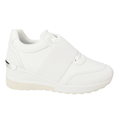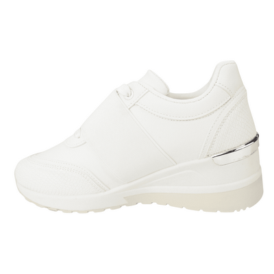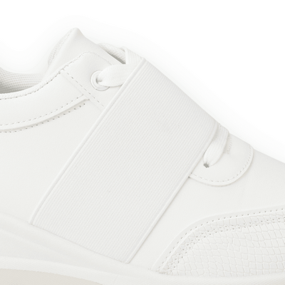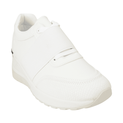 Zapatilla de Mujer New Walk Blanca Casual. Capellada texturizada en símil cuero liso y reptil. Cierre mediante cordones al tono. Placa metálica en zona trasera. Malla antitranspirante. Planta de Plataforma de 5.5 cm de altura. Caña de 6.5 cm de altura.