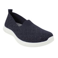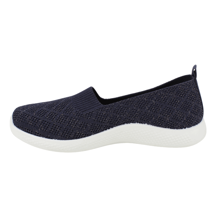 Zapatilla de Mujer New Walk color azul marino. Estilo Casuales. La combinación perfecta entre ligereza y elegancia sutil. Estas zapatillas tipo slip-on están confeccionados en un tejido de punto flexible que se adapta a tu pie como un guante. El acabado azul marino cuenta con delicados destellos metálicos que añaden un toque especial a tu calzado de descanso o ejercicio ligero. Gracias a la tecnología de su plantilla Eccoflex, disfrutarás de una amortiguación superior que cuida tus pies durante largas jornadas. Ajuste tipo Slip On. Plataforma de 2,5 cm de alto y caña de 5 cm de altura.