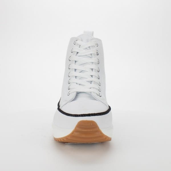 Zapatilla urbana New Wall color Blanco. Capellada de Lona con ojales metálicos y punta de goma. Cordones planos Blancos. Caña de 11cm y plantade 4cm de altura.