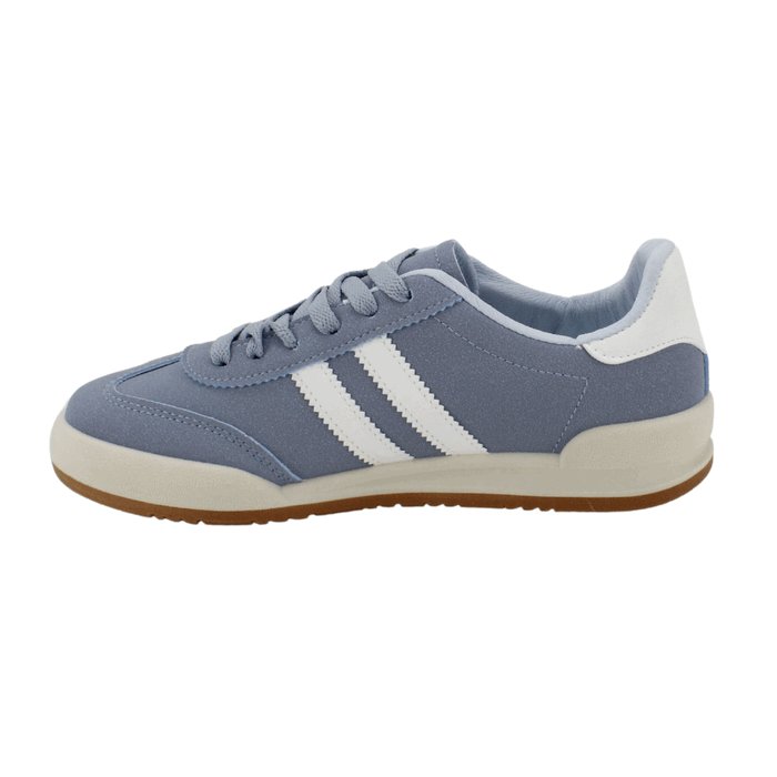 Zapatilla de Mujer New Walk Celeste. Estilo Urbano. Capellada en símil cuero, la combinación de verde con las dos bandas blancas y la suela de goma color crema le dan un toque retro pero actual. Perfectas para el día a día y para combinar con una amplia variedad de outfits. Ajuste mediante cordones planos a tono. Plataforma de 2,5 cm de altura y caña de 6,5 cm de alto.