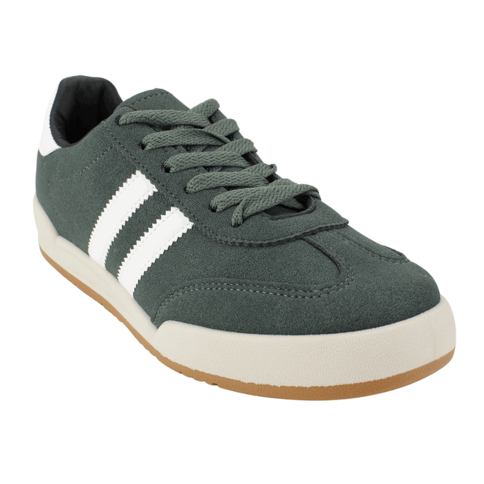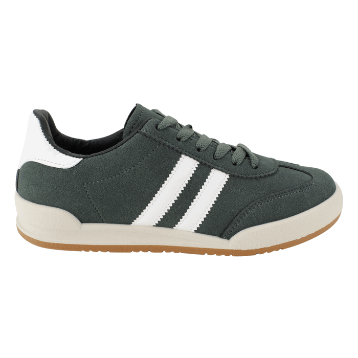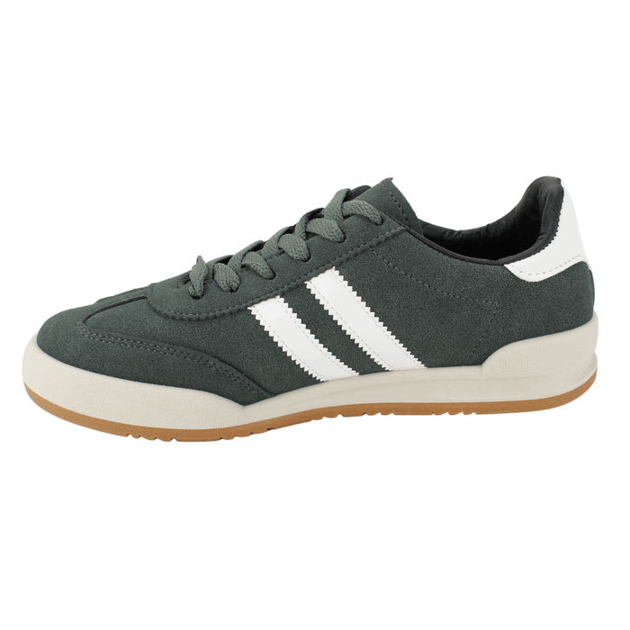 Zapatilla de Mujer New Walk Verde Petróleo. Estilo Urbano. Capellada en símil cuero, la combinación de verde con las dos bandas blancas y la suela de goma color crema le dan un toque retro pero actual. Perfectas para el día a día y para combinar con una amplia variedad de outfits. Ajuste mediante cordones planos a tono. Plataforma de 2,5 cm de altura y caña de 6,5 cm de alto.