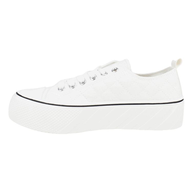Zapatilla Mujer New Walk color Blanco. Estilo Urbano. Diseño de capellada en lona con detalles de costuras cruzadas a lo largo del calzado con punta de goma y detalles en relieve en la planta. Ajuste mediante cordones planos blancos. Plataforma de 4 cm de alto y caña de 4,5 cm de altura.