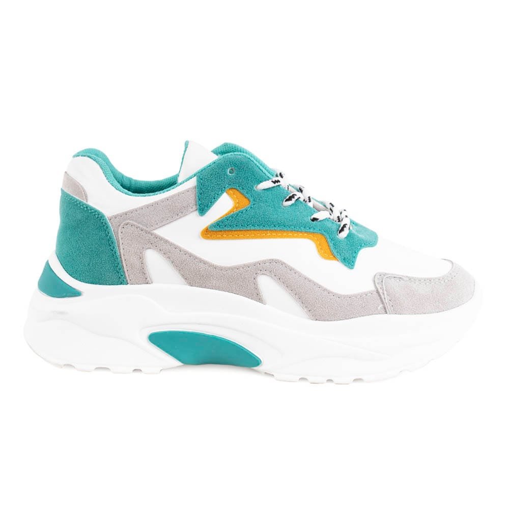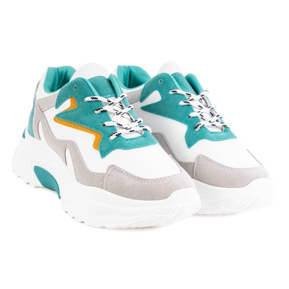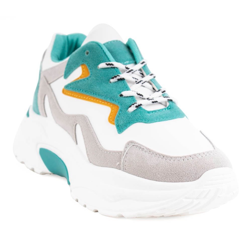 Zapatilla urbana multicolor. Capellada símil gamuza con cordones redondos rayados. Taco de 5 cm de altura y caña de 5,5 cm.
