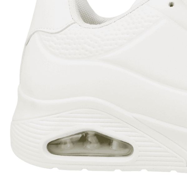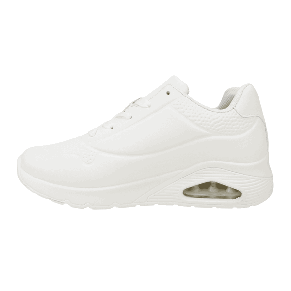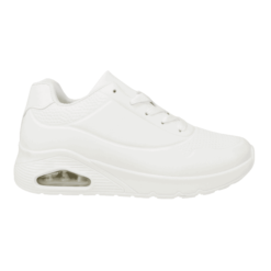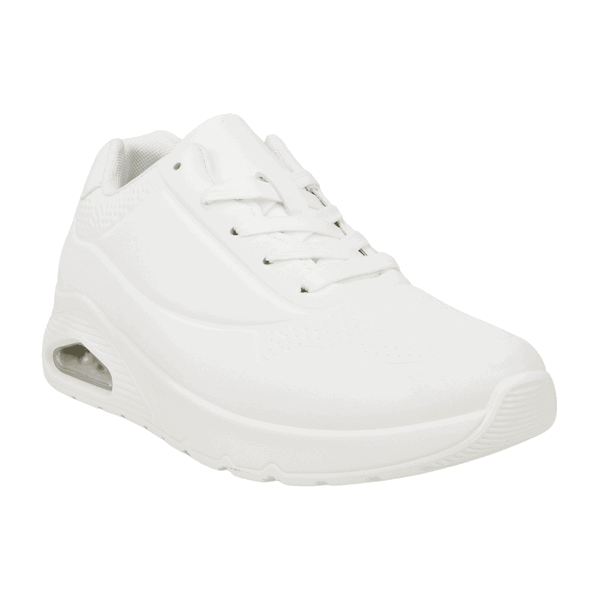 Zapatilla de Mujer New Walk color blanco. Estilo Urbano. Capellada en símil cuero con detalles de relieves en punta y costados superiores con burbuja de aire en la planta para una mayor comodidad en el uso diario. Ajuste mediante cordones planos blancos. Plataforma de 4,5 cm de alto y caña de 7 cm de altura.