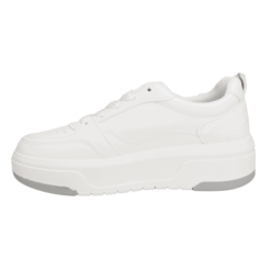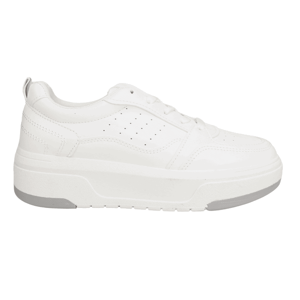 Zapatilla de Mujer New Walk color blanco. Estilo Urbano. Capellada en símil cuero con detalles de perforaciones en punta y costados con costuras dobles a la vista. Ajuste mediante cordones planos blancos. Plataforma de 4,5 cm de alto con planta en gris y blanco y caña de 6 cm de altura.