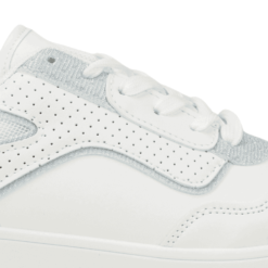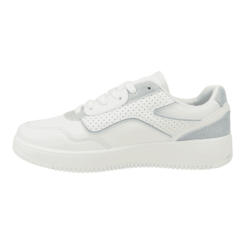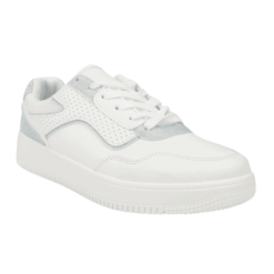 Zapatilla de Mujer New Walk color blanco. Estilo Urbano. Capellada en símil cuero con detalles de perforaciones en costados con capas en tono celeste brillante que dan un toque único. Ajuste mediante cordones planos blancos. Plataforma de 3 cm de alto y caña de 5,5 cm de altura.