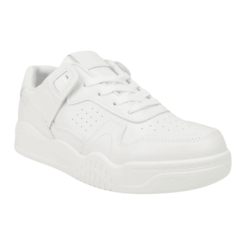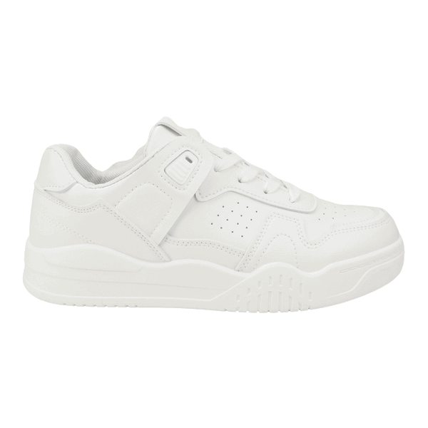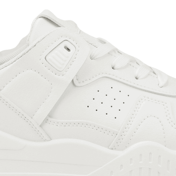 Zapatilla de Mujer New Walk color blanco. Estilo Urbano. Capellada en símil cuero con detalles de costados y punta con perforaciones y costuras dobles visibles en las distintas partes del calzado. Ajuste mediante cordones planos blancos con ojal superior con goma para mejor ajuste. Plataforma de 3 cm de alto y caña de 5,5 cm de altura.