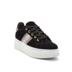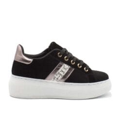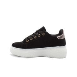 Zapatilla Mujer New Walk estilo urbano color negro. Capellada simil gamuza con aplicación metalizada y texturado reptil. Cordones planos al tono. Planta de 5 cms de altura y caña de 7 cms. Materialidades Capellada de Poliuretano. Forro en textil y planta de PVC. Horma Normal