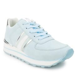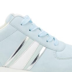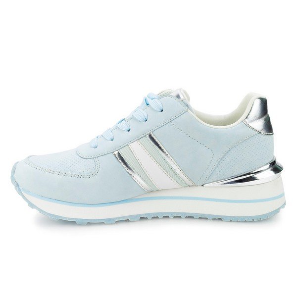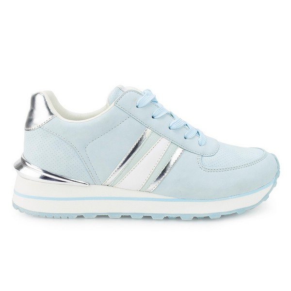 Zapatilla Mujer New Walk color Celeste. Estilo urbano. Diseño deportivo con líneas decorativas, refuerzo en talón y tobillo en plateado, cordones planos a tono. Tipo de Cierre: Cordones. Forma de planta: Plataforma. Altura exacta: 5 cm. Forma de punta Redonda. Altura caña 6 cm.