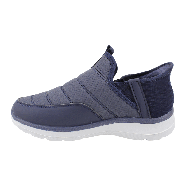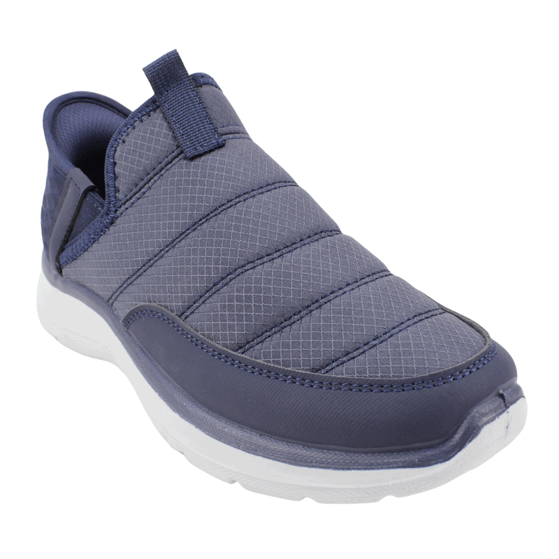 Zapatilla de Mujer New Walk color azul marino. Estilo Casual. Dale un upgrade a tu estilo diario con estas zapatillas Slip-On, diseñadas para quienes buscan la mezcla perfecta entre una estética urbana moderna y una funcionalidad superior. Este modelo destaca por su capellada textil acolchada con costuras reforzadas que no solo aportan una textura visual única, sino que envuelven el pie en una sensación de suavidad y flexibilidad constante. Al ser un calzado sin cordones, incorpora bandas elásticas laterales de alta resistencia que permiten un calce instantáneo y seguro, ideal para esos días en los que necesitas salir rápido sin perder la onda. Su suela en contraste blanco no solo es ultra liviana para evitar el cansancio, sino que ofrece una amortiguación ideal para caminar por la ciudad, mientras que los refuerzos sintéticos en la punta y el talón aseguran que te acompañen por mucho tiempo. Son el complemento definitivo para unos joggers o jeans desgastados, dándote ese look relajado y auténtico que tanto buscas para tu rutina o tus salidas de fin de semana. Plataforma de 3,5 cm alto y caña de 6,5 cm de altura.