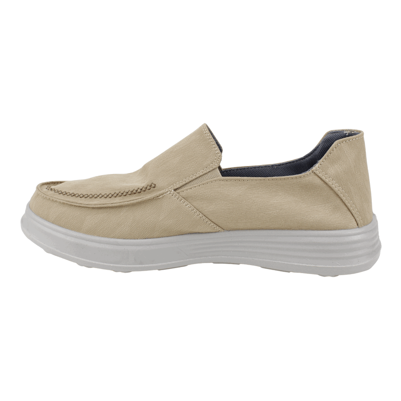 Zapatilla de Hombre New Walk color beige. Estilo Casual. Diseñada para un ajuste ergonómico, esta zapatilla destaca por su capellada de tejido tecnológico que se adapta a la forma del pie como una segunda piel, eliminando la necesidad de cordones. El diseño incorpora un patrón de líneas dinámicas en el empeine que aporta textura y un aire deportivo sofisticado a su estructura monocromática. La suela de gran volumen con relieves laterales garantiza una tracción óptima y una absorción de impactos eficiente, convirtiéndola en un modelo híbrido ideal para el uso diario intenso con un estilo vanguardista. Ajuste tipo Slip On. Plantilla confort especial para el uso diario. Planta de 3,5 cm de alto y caña de 5,5 cm de altura.