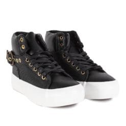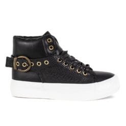 Zapatilla Mujer New Walk Negra. Estilo urbano. Capellada símil cuero con detalle textura snake y hebilla decorativa con ojetillos. Planta de 3,5 cm de altura. Caña de 10cm. Ajuste mediante cordones planos al tono.