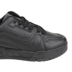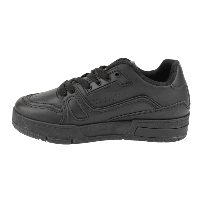 Zapatilla Unisex New Walk color negro. Estilo Urbano y Escolar. Diseño de capellada en símil cuero texturizado con detalles de costuras dobles y punta y costados perforados para una mejor ventilación. Ajuste mediante cordones planos a tono. Planta de 3,5 cm de alto y caña de 7 cm de altura.